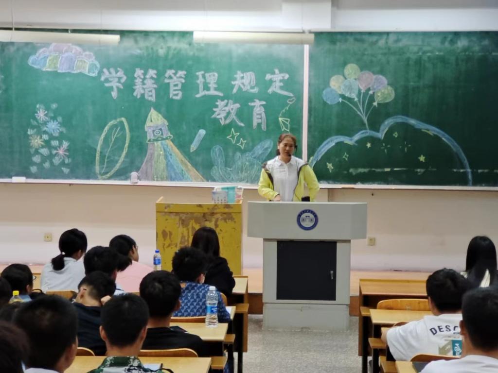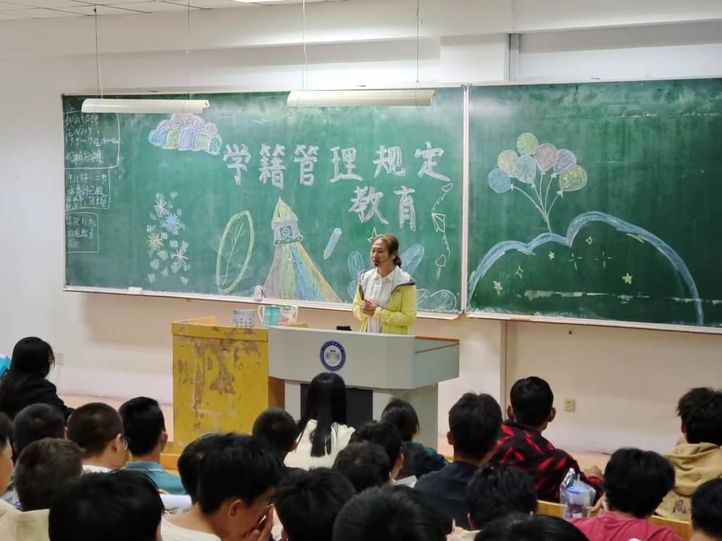 学院教务科徐海梅老师为新生详细讲解了学校关于入学与注册、成绩考核与记载办法、考风考纪、留降级、转专业与转学、休学与复学、退学、考勤与纪律、奖励与处分以及学位授予等有关规定。教育引导学生端正学习态度,养成良好学习习惯,严肃考风考纪。