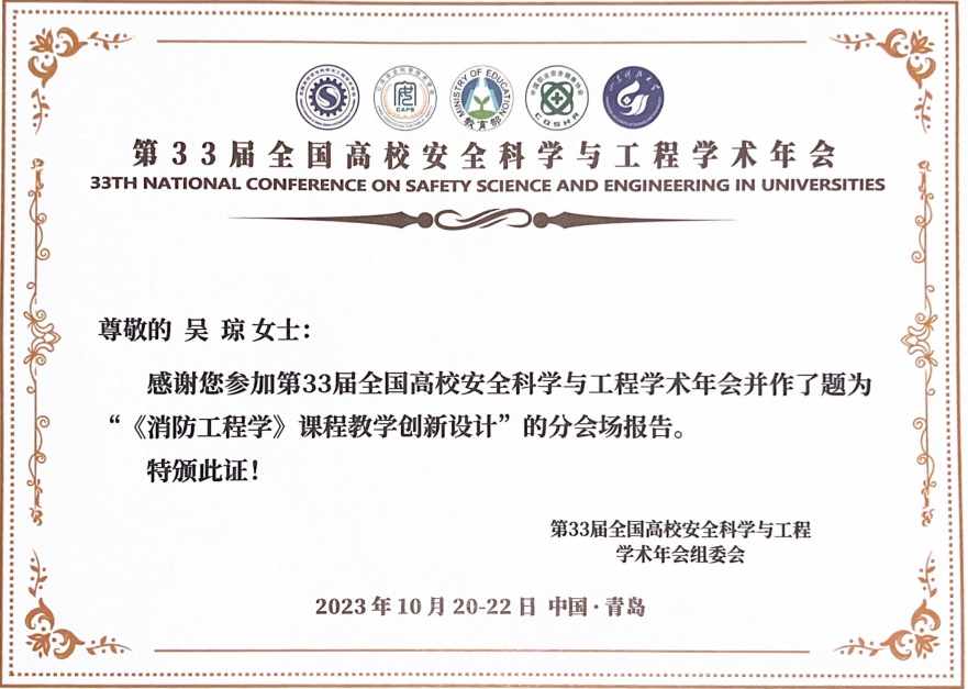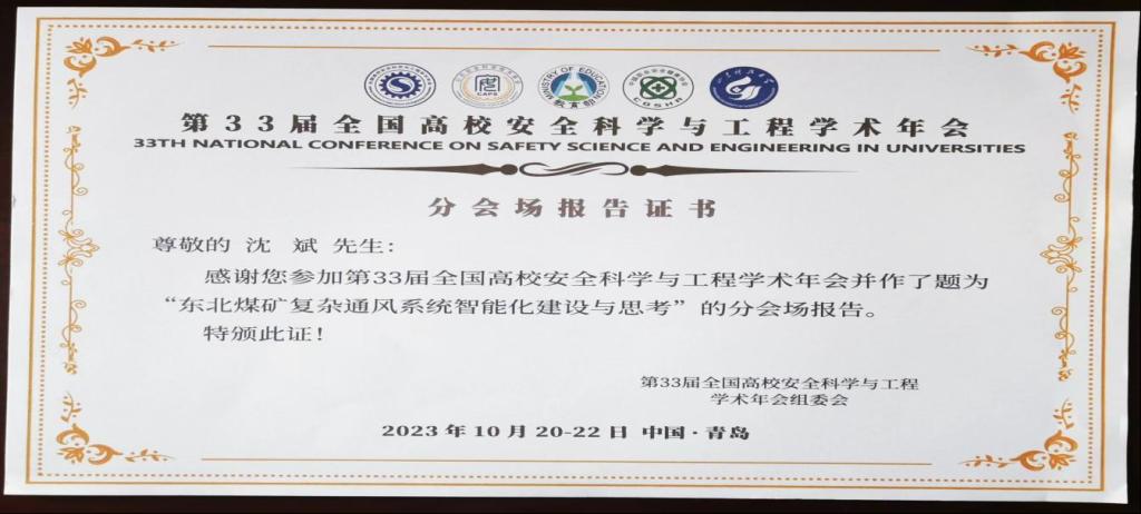 10月20日-22日,第33届全国高校安全科学与工程学术年会在山东青岛成功举办。会议由公共安全科学技术学会、全国高校安全科学与工程学术年会委员会主办,会议同期开展了第6届全国高校安全科学与工程青年教师教学大赛、第8届全国高校安全科学与工程研究生论坛、第9届全国高校安全科学与工程大学生实践与创新作品大赛及首届“捷安杯”安全科学与工程类专业技能竞赛全国总决赛等活动。院长徐锋、副院长沈斌及学院各专业教师与学生等参加了会议。其中,副院长沈斌在年会上以《东北煤矿复杂通风系统智能化建设与思考》、安全工程系副主任吴琼以《消防工程学》为题进行了分会场报告;学生赵孟真,获得作品大赛一等奖。