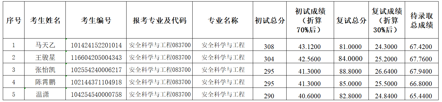 我院2024年安全科学与工程专业硕士研究生第二批调剂复试工作已结束,现将考生复试成绩及待录取名单公示如下,公示期为3天。
