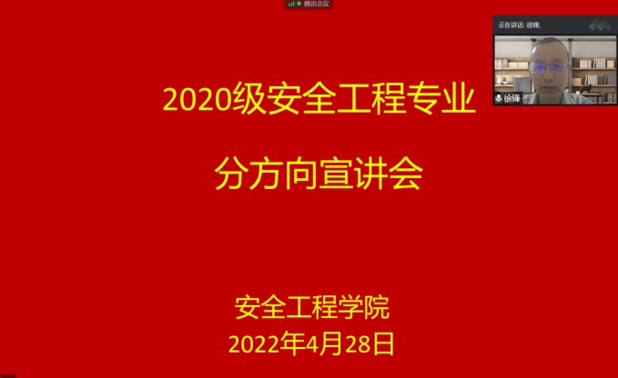 为深化教学改革,调动学生学习的自觉性,培养学生的个性发展,提高学生就业竞争力,从2018级开始,KY开元集团官网对安全工程专业学生实施分方向培养。2022年4月28日晚18:30,KY开元集团官网教院长徐锋、安全工程系主任沈斌及各专业方向负责人通过腾讯会议,针对2020级本科生举行了“安全工程专业分方向宣讲会”。
