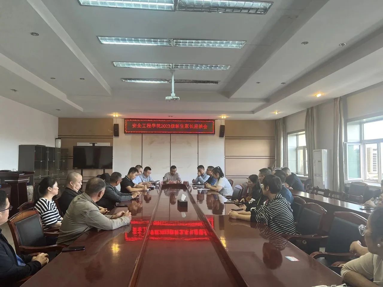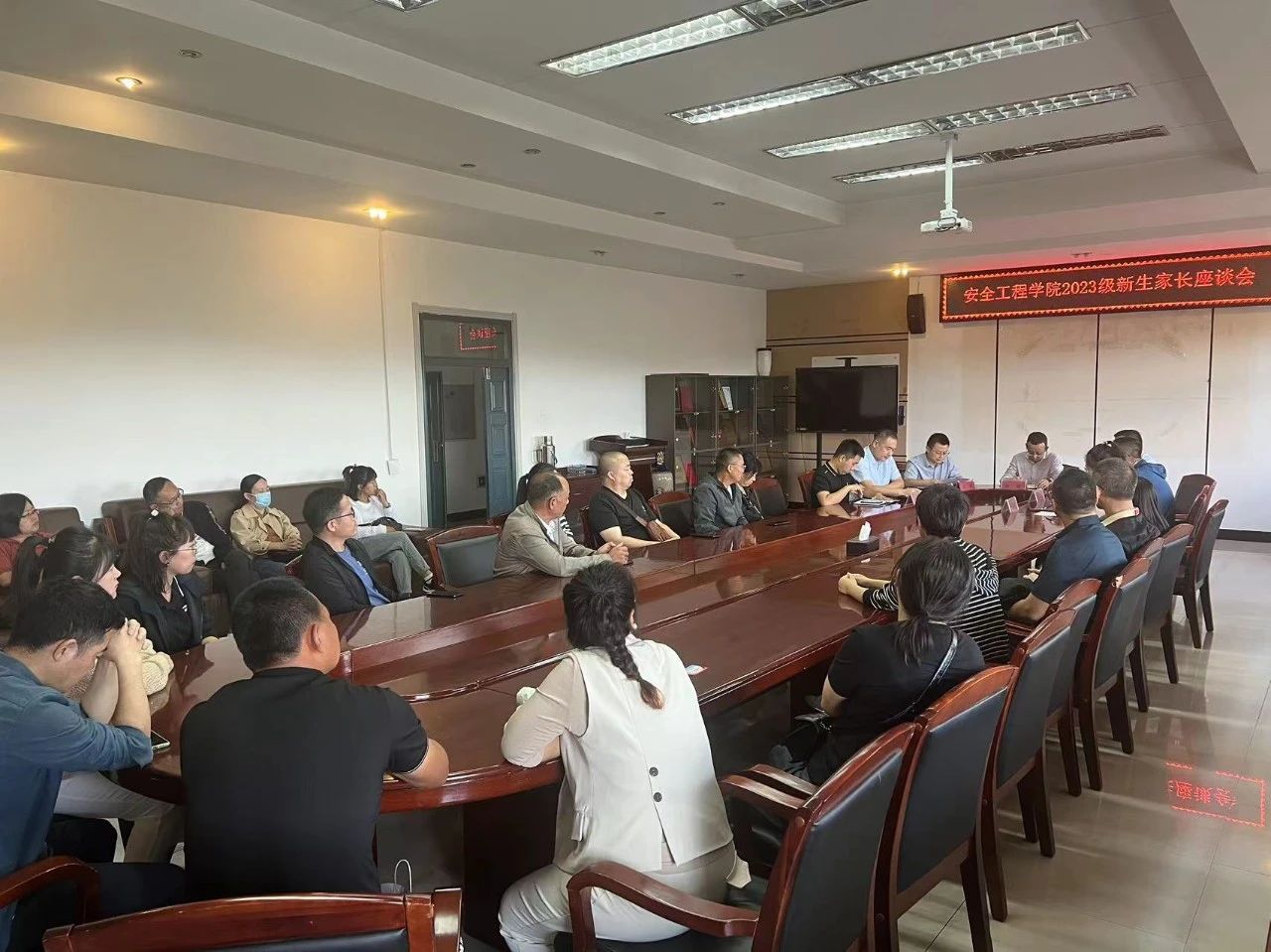 为进一步畅通家校联络渠道,推动家校协同育人工作发挥实效,全方位服务学生成长成才,我院于8月31日14:00在学院会议室召开了2023级新生家长座谈会。院长徐锋、副院长沈斌、安全工程系系主任王亚军、应急技术与管理系主任刘传海、学工办主任刘科然、团委书记新生辅导员薛广鑫以及70余位新生家长参加了座谈会,座谈会由党委副书记郑红岩主持。